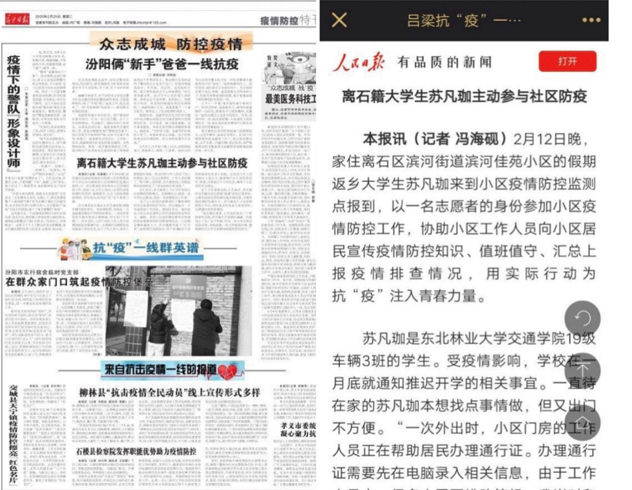 交通学院2019 级车辆 3 班苏凡珈同学参与家乡社区防疫工作事迹被吕梁日报报道