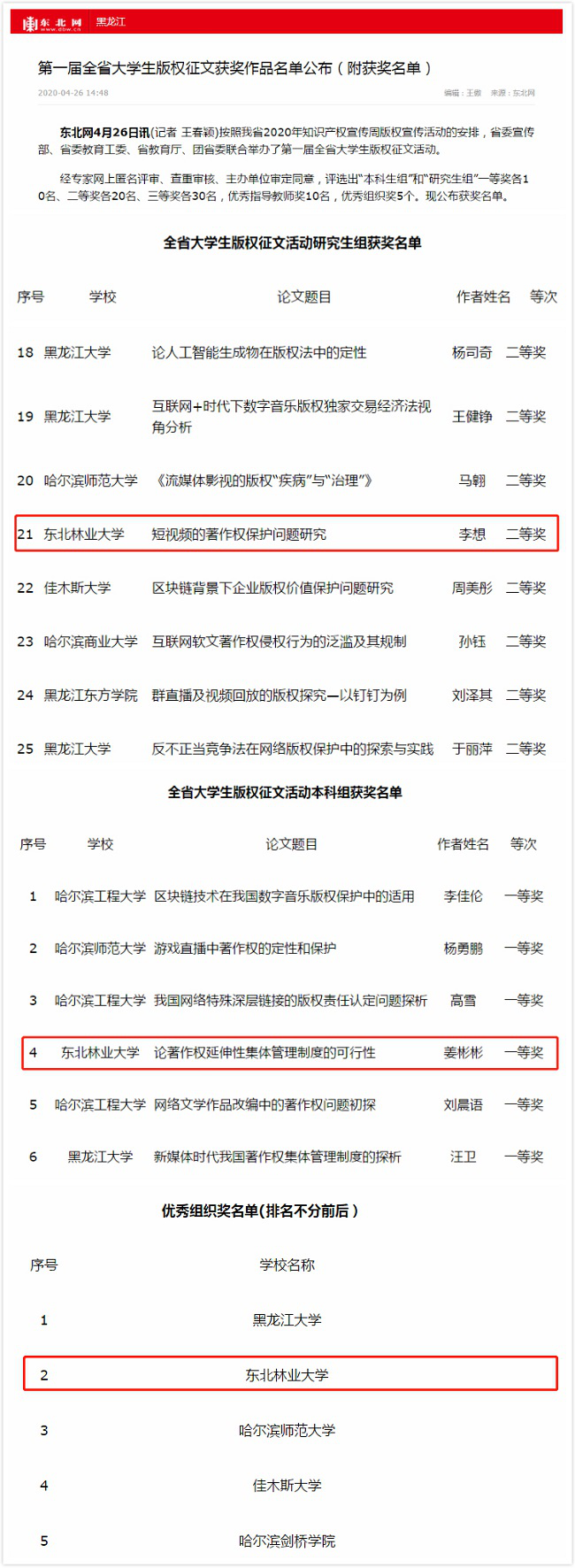 4月26日,在“世界知识产权日”当日,第一届黑龙江省大学生版权征文活动圆满落幕。我校推荐选送的征文作品获本科生组一等奖1项,研究生组二等奖1项。我校荣获活动“优秀组织奖”,全省仅5所高校获此殊荣。