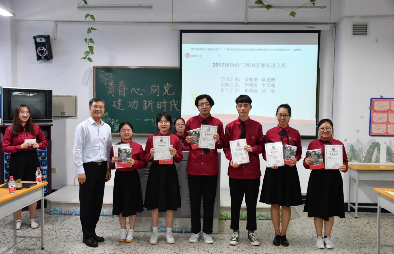 5月16日14时,在文博楼808教室,外国语学院英语专业2017级3班团支部举行了学习习近平总书记在纪念五四运动100周年大会上的重要讲话精神主题团日活动,学校党委书记张志坤、副校长雒文虎深入班级团支部,并与团员亲切交流。