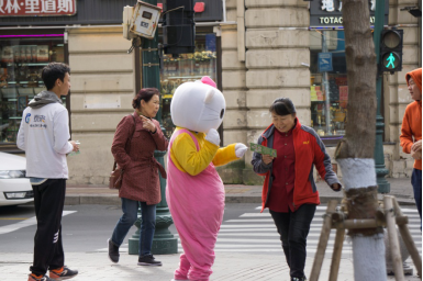 志愿者们穿上展会工作的“人偶装”手持宣传单宣传