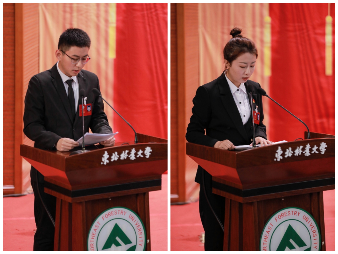 17时,大会闭幕式在成栋楼四楼报告厅举行,会上审议通过了《东北林业大学学生会章程》《东北林业大学研究生会章程》等各项决议,第十一届研究生会执行主席鲁子煜宣读了倡议书,大会倡议大家要不负青春、不负韶华,把个人理想汇入时代洪流,让蓬勃青春与家国情怀共振,在实现中华民族伟大复兴中国梦的新长征路上奋勇搏击。大会在《歌唱祖国》的激昂合唱和“青春磨砺出彩,挑战成就未来”的响亮口号中圆满落幕。