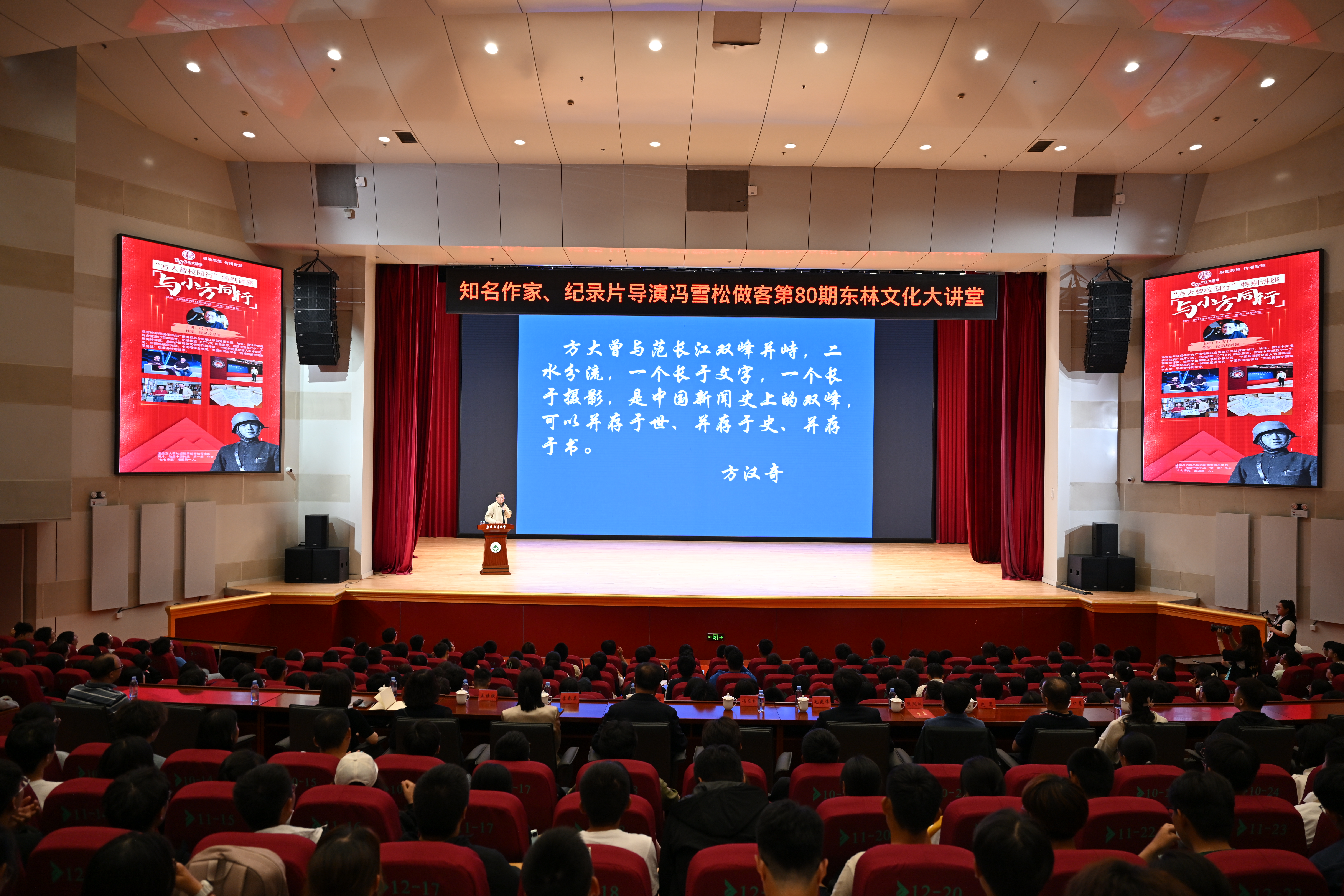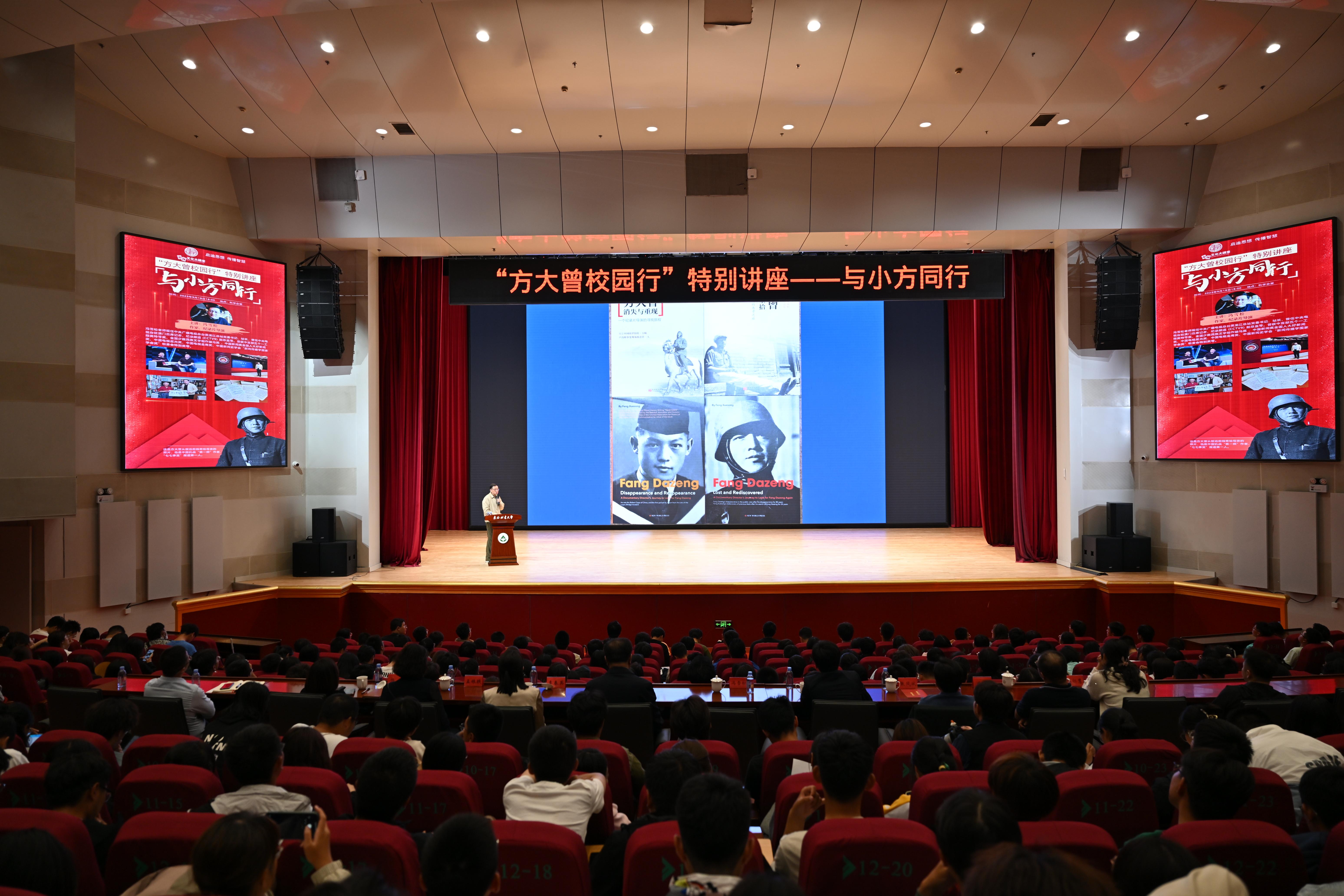 9月18日,“方大曾校园行”特别讲座《与小方同行》走进第80期《东林文化大讲堂》,知名作家、纪录片导演冯雪松走进东林,分享自己20多年持续追踪中国战地记者先驱方大曾的经历,讲述了方大曾的传奇人生和理想。学校党委常委、副校长孙猛出席活动,党委宣传部、图书馆、团委有关负责同志与近千名东林青年现场聆听报告。