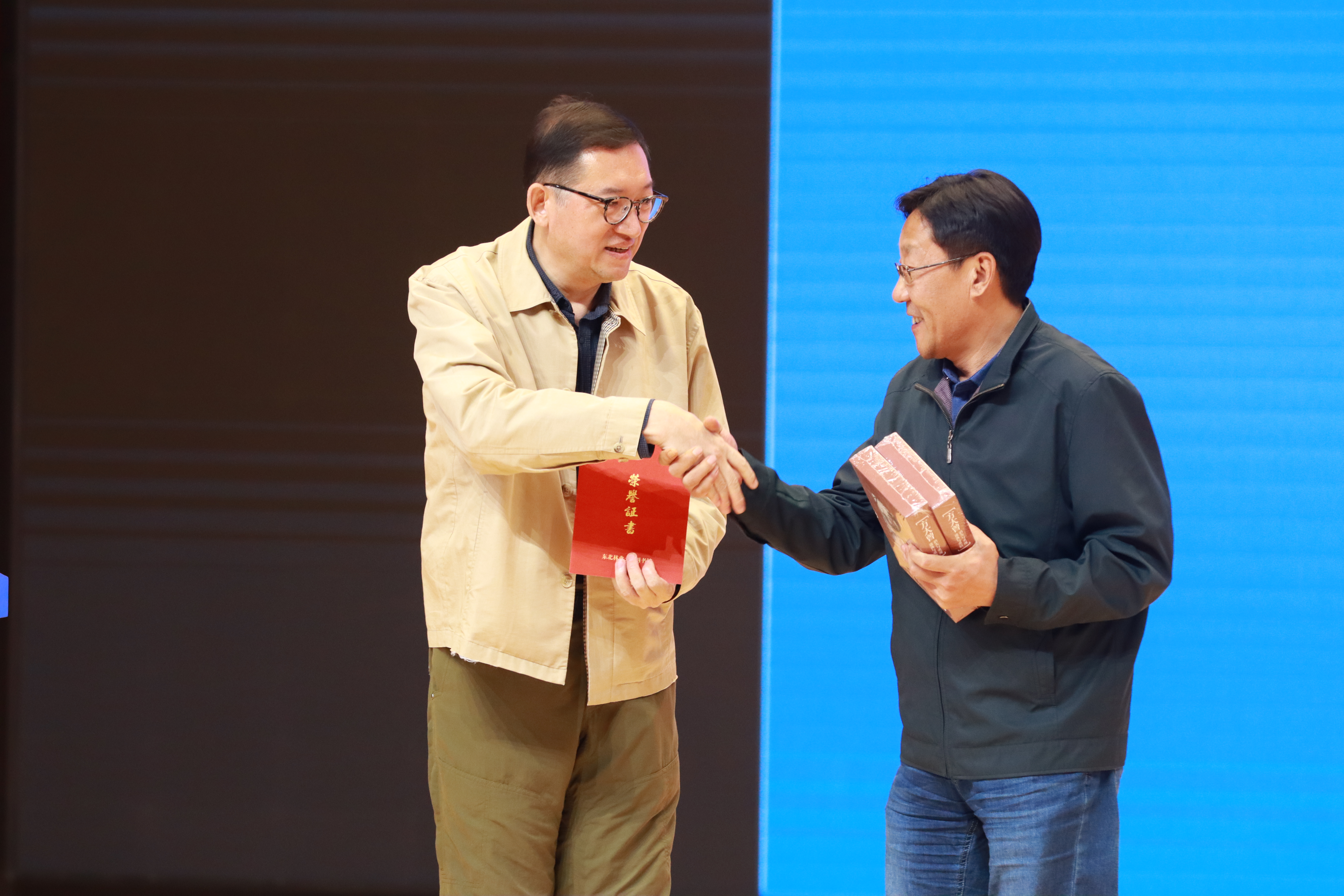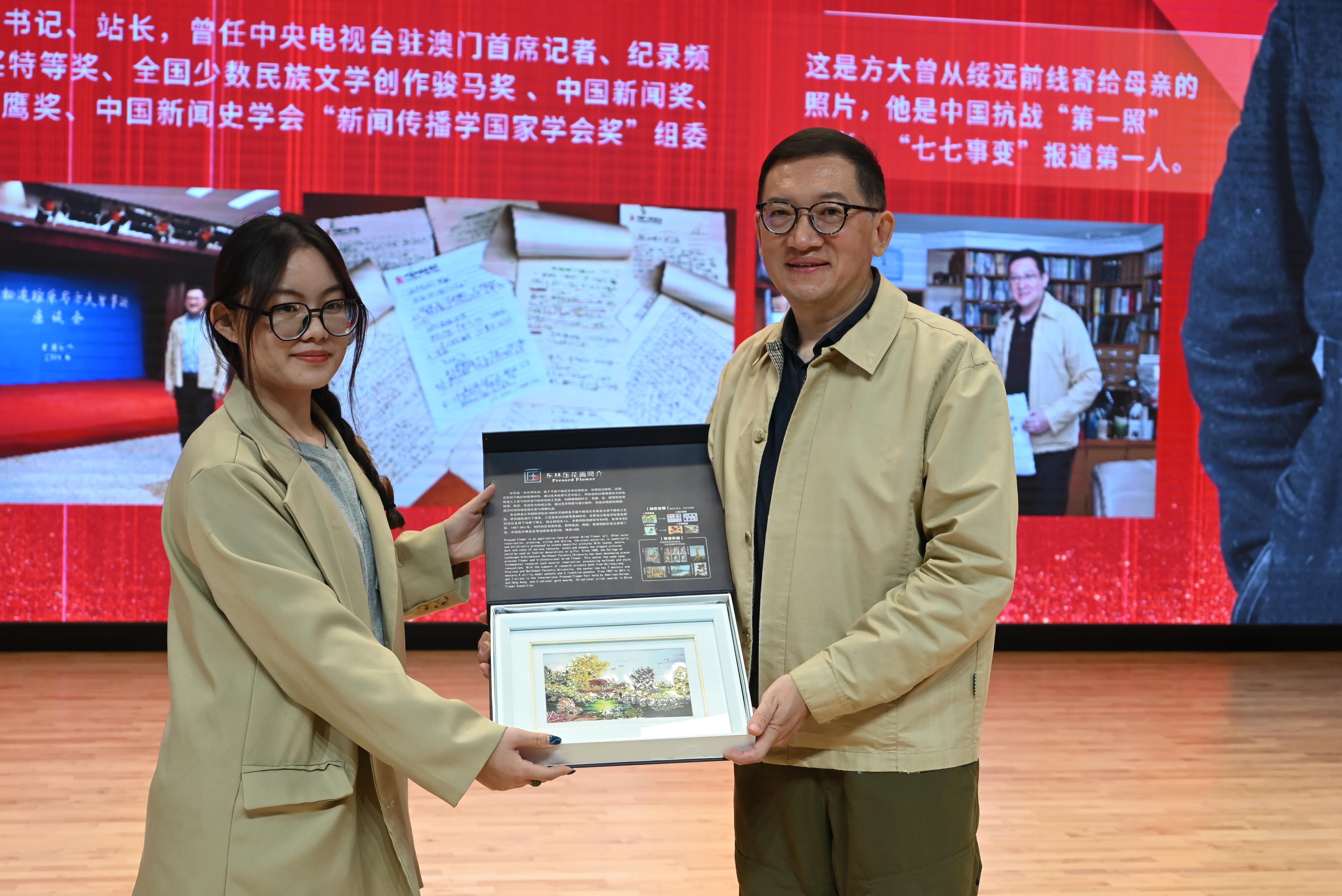 活动中,冯雪松向学校捐赠两套专著,图书馆馆长张凤斌代表学校颁发捐赠证书,学生代表向冯雪松赠送了手工压花作品。