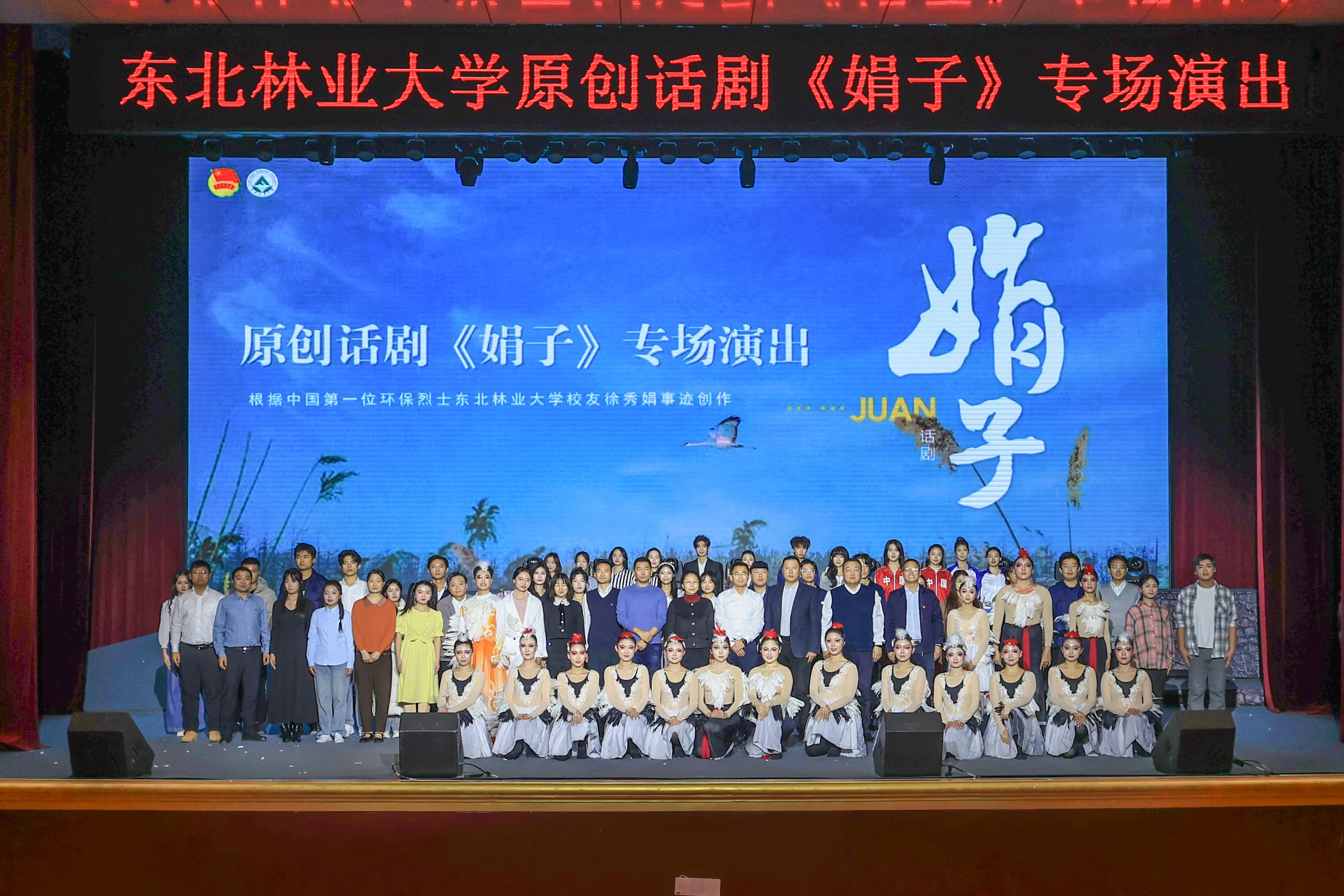 在徐秀娟一家三代护鹤群体被授予“龙江楷模”称号之际,12月3日晚,根据中国第一位环保烈士徐秀娟校友事迹创作的话剧《娟子》在学校科学会堂深情上演,百余名学生演职人员将徐秀娟的动人故事栩栩如生地呈现在了舞台上,学校党委常委、副校长张春雷、11所省内高校师生代表现场观看演出。