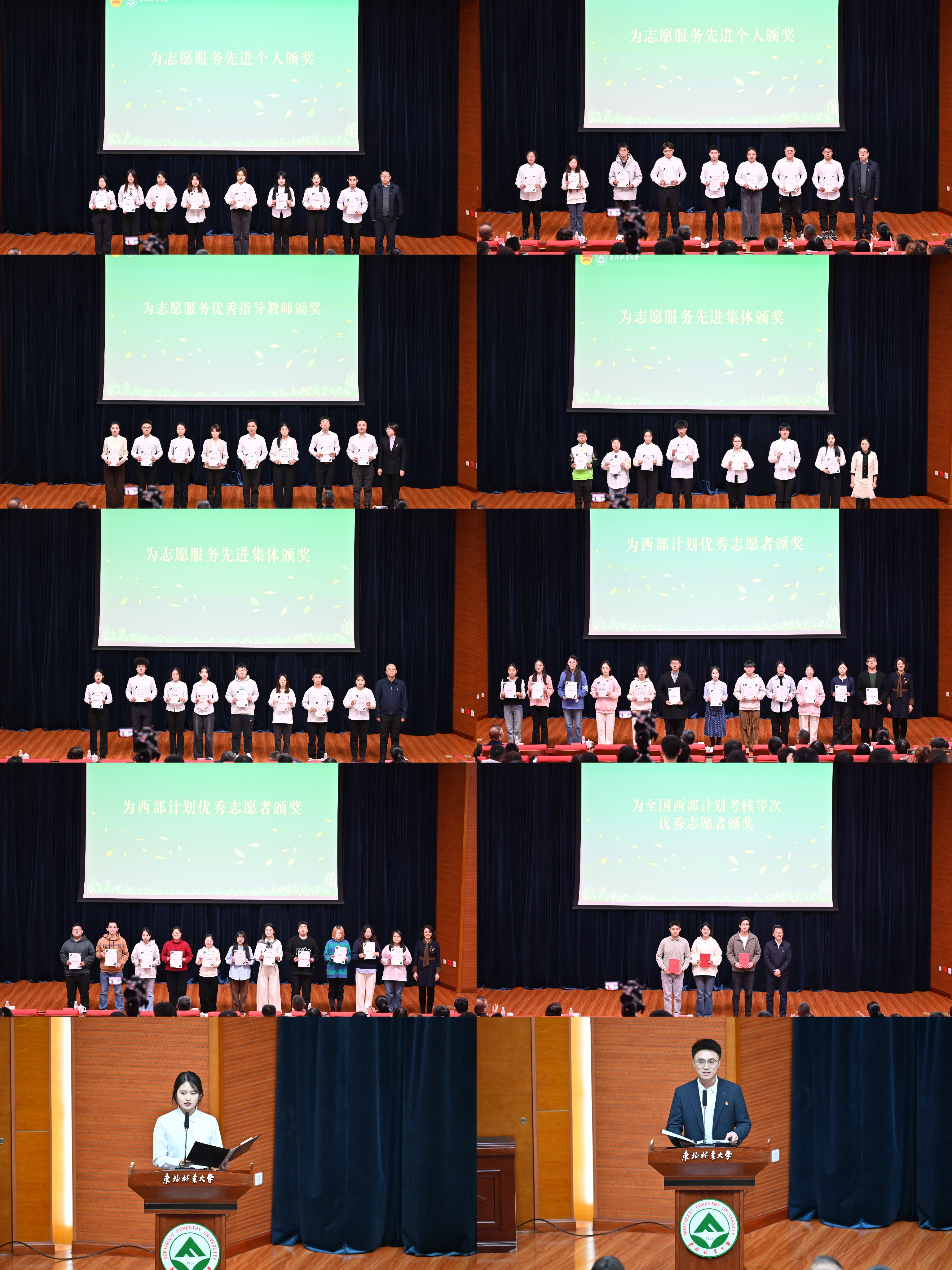 会上宣读了《关于表彰2023—2024年度志愿服务工作先进集体和个人的决定》,9位教师、348名同学、27名西部计划志愿者、15家青年志愿者协会受到表彰。土木与交通学院教师管峰、材料科学与工程学院学生赵芯悦分享了他们在组织、参与志愿服务工作中的经历和感受。
