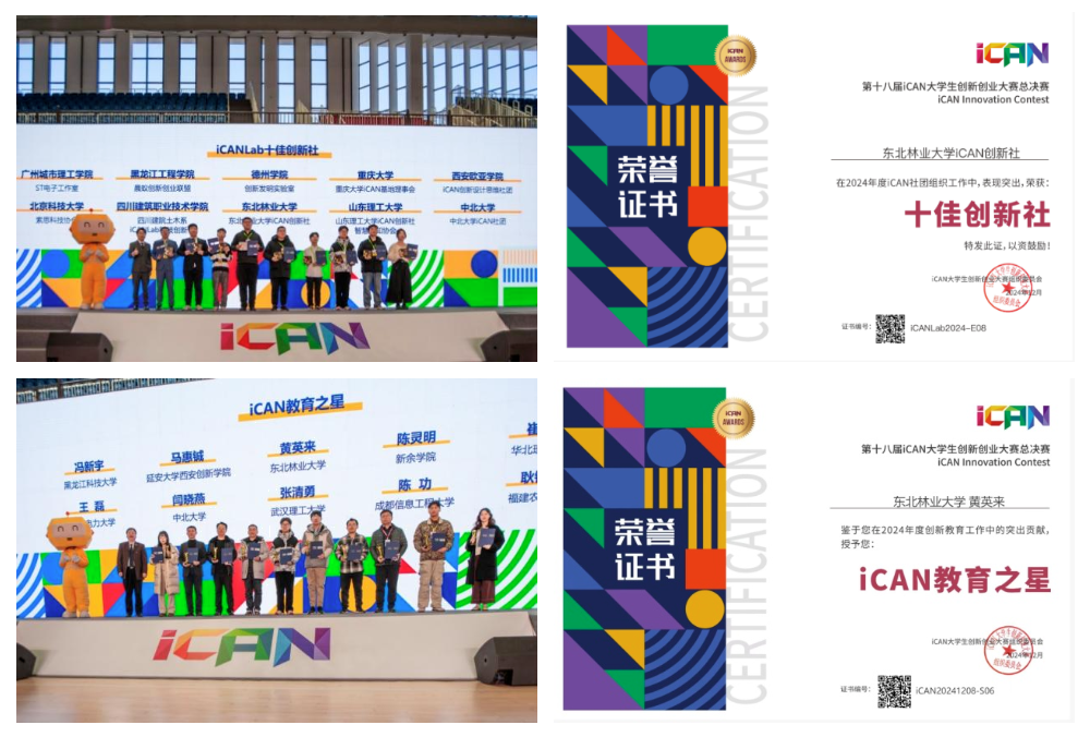 近日,第十八届iCAN大学生创新创业大赛总决赛在山东农业工程学院(淄博校区)落下帷幕。我校iCAN创新社在2024年度iCAN社团组织工作中,表现突出,荣获“十佳创新社”荣誉称号;社团指导教师(发起人)黄英来荣获“iCAN教育之星”。iCANLab是iCAN大赛与全国高校师生共同打造的创新学习类社团,每年度iCAN大学生创新创业大赛组委会共评选“十佳创新社”10家。