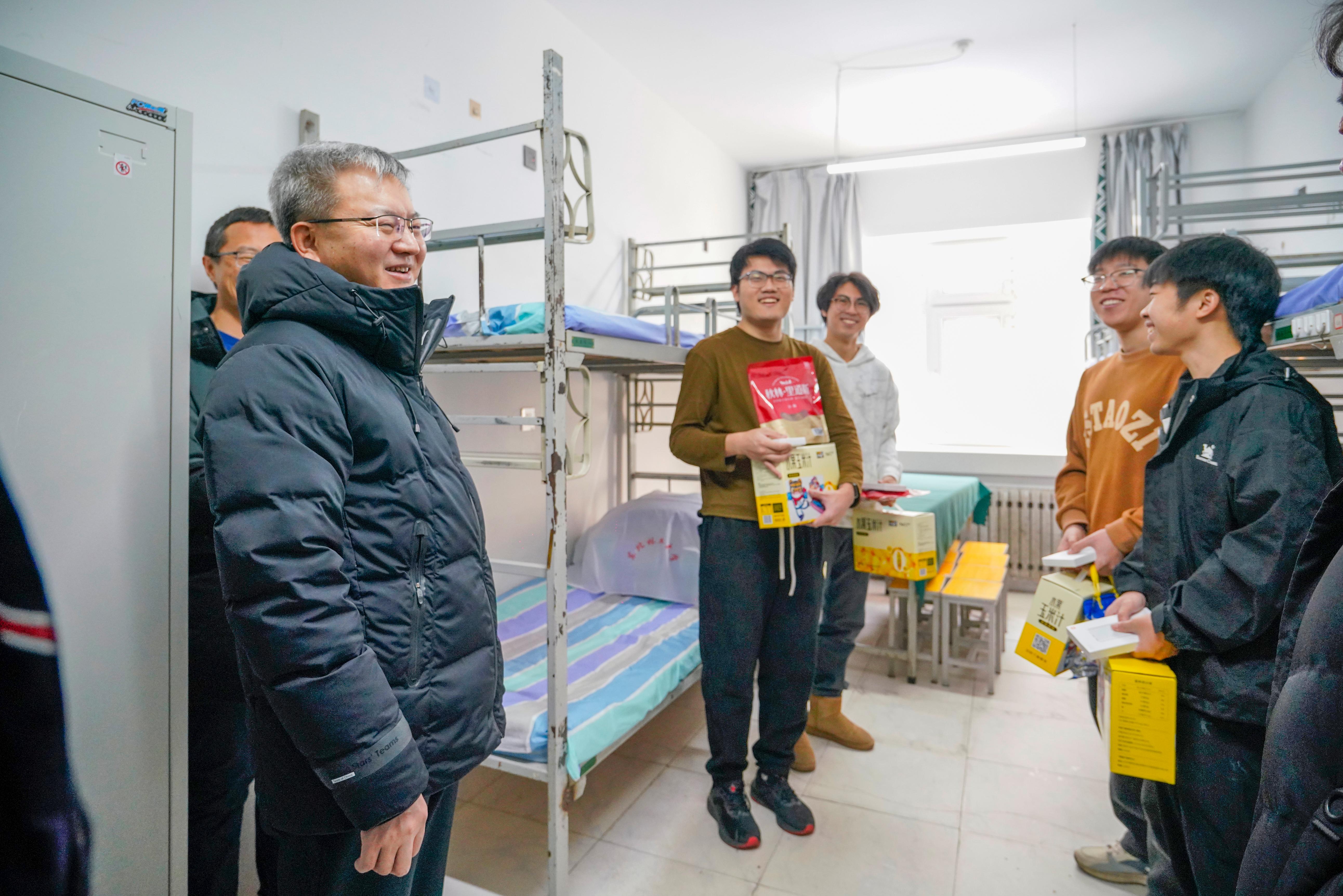 张金丰来到学生寝室同大家亲切交流,了解在校生活和岗位工作开展情况,向志愿者们在春节期间放弃与家人团聚,仍然坚守岗位致敬、点赞,并送上了节日祝福和诚挚慰问。他表示,同学们要大力弘扬志愿精神,增强责任感和使命感,以优质服务和饱满热情展现龙江青年风采,为亚冬盛会献礼。