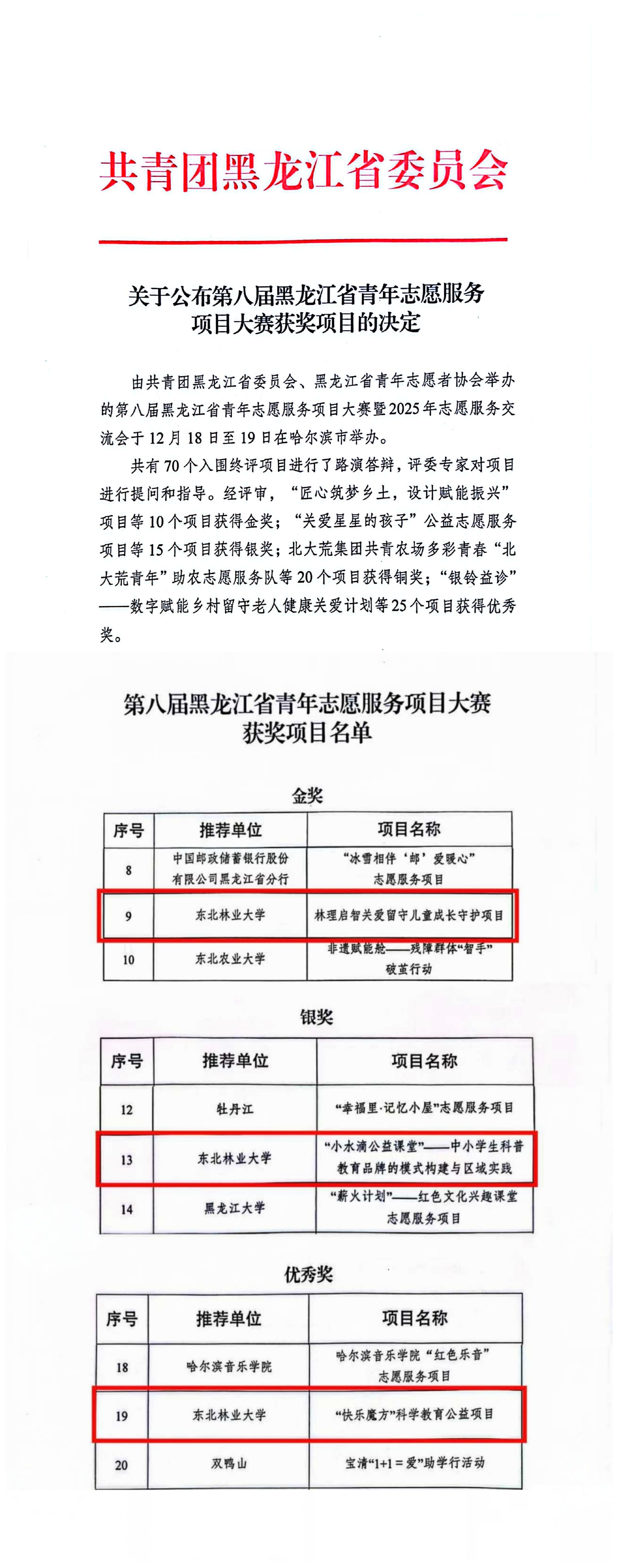 近日,第八届黑龙江省青年志愿服务项目大赛评审结果公布,学校理学院绿冀青年志愿者协会《林理启智关爱留守儿童成长守护》项目荣获金奖,生命学院“小水滴公益课堂”《中小学生科普教育品牌的模式构建与区域实践》项目荣获银奖,机电学院同梦飞扬志愿者协会《“快乐魔方”科学教育公益项目》荣获优秀奖。