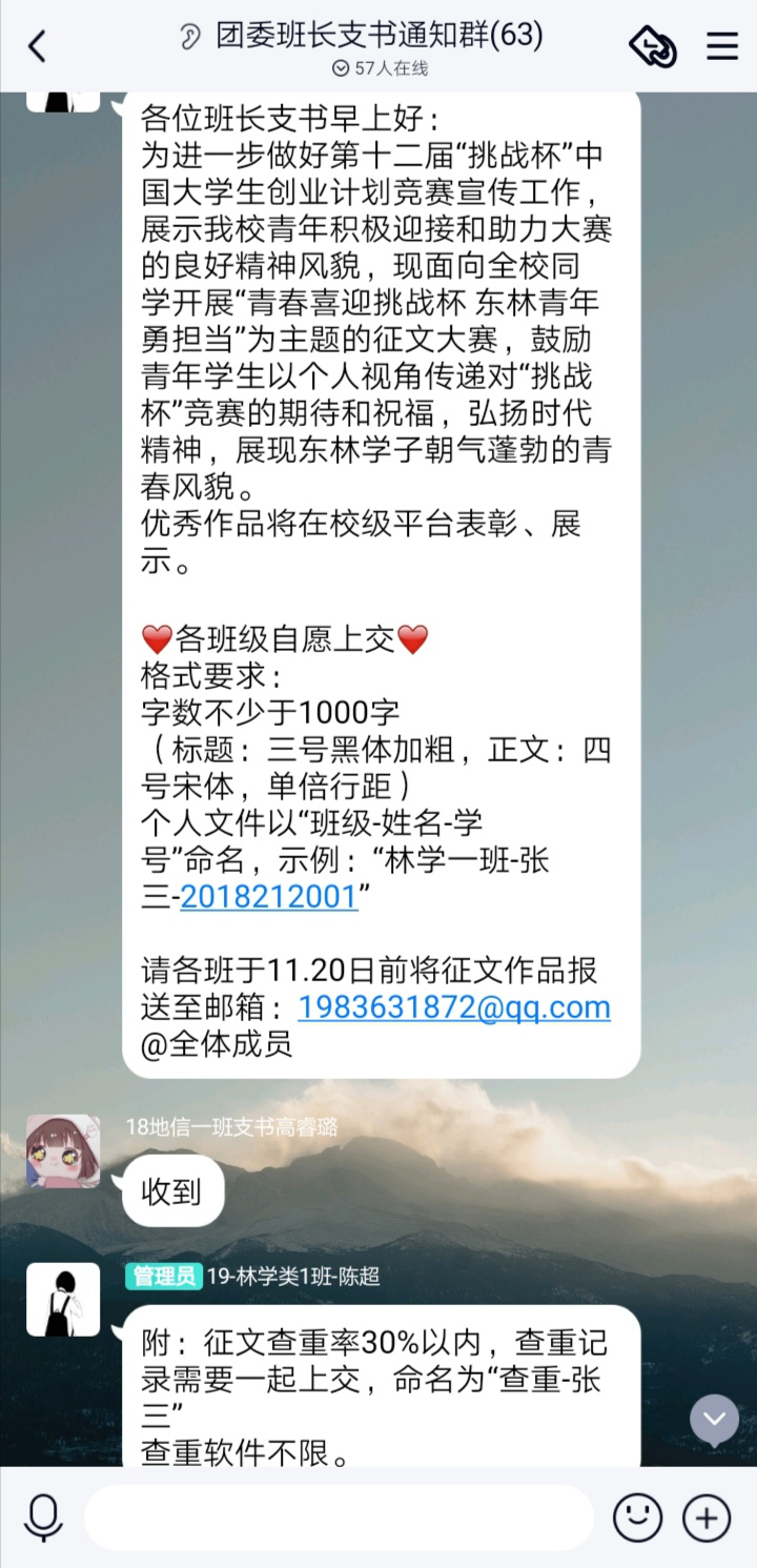 截至目前,已有部分同学将本次演讲和征文比赛参赛作品发送到院团委邮箱,其他同学正在积极准备中。其中19级林学三班同学付弘达在他的作品《青春你我 挑战未来》中写道:“我相信作为一名东林人,我们每个人心中都有一股创业精神,都有一股想要挑战的劲。‘挑战杯’举办这些年来,我们学校都获得了很不错的成绩和很值得骄傲的成就,对每一位曾经参加过这项竞赛的同学来说,都具有非凡的意义。”20级林学二班王艺霖同学在她的参赛作品《 勇于“挑战”——东林学子未来可期》中写道:“在挑战杯来临之际,我们大一新生真心的祝愿此次大赛能够取得圆满成功,希望所有同学能够积极踊跃的参加,参赛选手乘风破浪,披荆斩棘,向着梦想出发,展现出属于我们东北林业大学,属于我们新一代青年的激情、热血与理想!彼时人间骄阳正好,风过林梢,我们正当年少。”