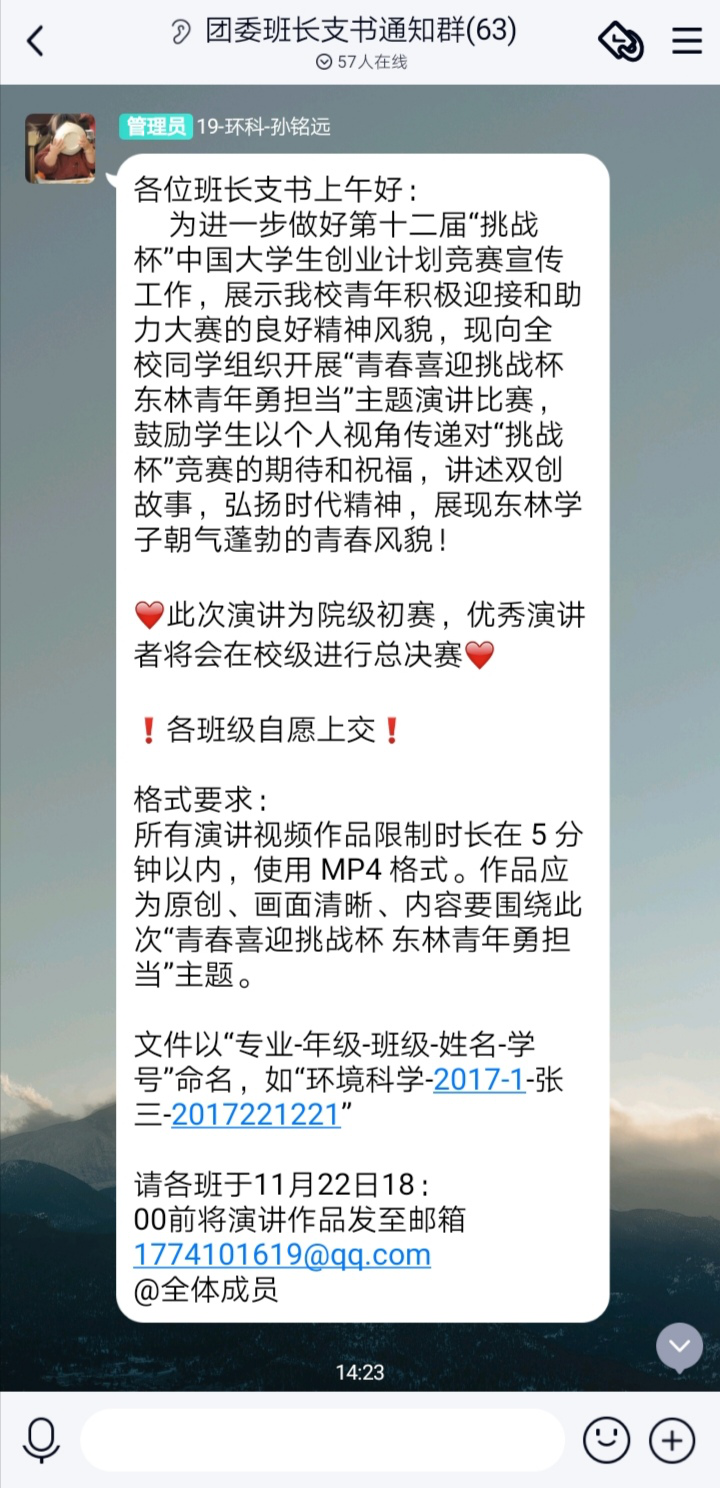 林学院团委充分发挥共青团思想引领的重要作用,深入开展宣传教育工作,大力宣传我校在“挑战杯”活动中的任务,承办过程中担任的重要工作,督促学院同学重视11月下旬-12月初在我校举行的决赛和闭幕式,引导学院同学积极投身“挑战杯”活动,迅速掀起学院同学提升创新创业能力的热潮。为充分展示林学院团员青年朝气蓬勃的青春风貌,进一步激发团员青年的创新创业热情,林学院团委已于11月16日和11月20日,组织开展主题征文、演讲活动,鼓励青年学生以个人视角传递对“挑战杯”竞赛的期待和祝福,展现林学院学子朝气蓬勃的青春风貌,进一步激发创新创业热情,持续扩大“挑战杯” 竞赛的育人功能和影响力。林学院团委各团支部开拓思路、发挥优势,鼓励和号召团员青年积极参与到主题征文、演讲活动中来。11月20日即将完成主题团日活动全方位覆盖,鼓励和支持开展形式多样、内容丰富的特色活动,引领团员青年通过研讨学习、关注赛事动态、观看活动视频、聆听创业大咖故事等方式,了解本届“挑战杯”竞赛活动整体情况,展示作为东道主的良好精神风貌,营造全体青年学生关注“挑战杯”赛事的浓厚氛围。