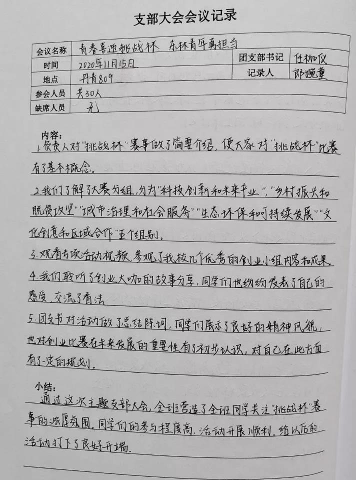 主题团日活动举办结束后,各团支部将团日活动记录在了支部大会会议记录手册上,支部大会会议记录手册不仅记录了团日活动开展的内容,而且记录了同学们的感想,进而增强同学们对“挑战杯”的理解,增大团日活动的宣传力度。