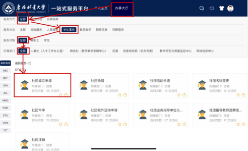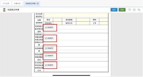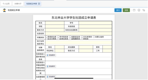 第一步:发起人登录办事大厅填写东北林业大学学生社团成立申请表单(见附件1),包括个人信息(姓名、学号、学院、年级班级、社团名称、社团职务、联系方式等)