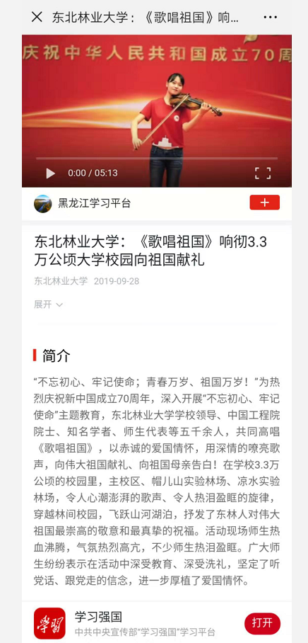 日前,“学习强国”平台发布东北林业大学师生《歌唱祖国》快闪MV。该MV在“学习强国”平台上线后,引发我校师生广泛热议,将...